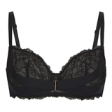 Ce soutien-gorge noir à armatures est fabriqué dans un micro tissu confortable. Les bonnets non préformés sont faits de dentelle semi-transparente combinée à de la maille. Les bretelles sont réglables et se rejoignent à l'arrière dans un entrejambe avec un détail en dentelle.