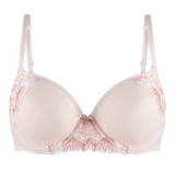 "Le soutien-gorge Mould présente des bonnets lisses et des bonnets brodés sur les côtés, avec un pendentif entre les deux. Ce soutien-gorge a un aspect luxueux et sexy,
