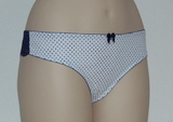 Cestring est blanc avec des pois bleu foncé, terminé par un nœud. Le dos est en dentelle bleu foncé.