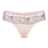 "La coquille se surpasse elle-même. Le dos du string est entièrement en maille. Le devant est fait de micro combinés avec des broderies. Le nœud avec un pendentif en forme de rose complète le look.