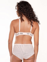 "La coquille se surpasse elle-même. Ce slip taille haute est légèrement correcteur, cachant facilement un petit ventre. Le dos de cette culotte est entièrement en maille. Le devant est composé de micro combinés à une broderie à motif floral pour un look encore plus luxueux. Le nœud avec un pendentif en forme de rose complète le look.