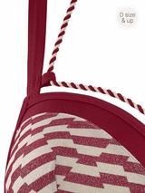 Réveillez la nymphe des mers qui sommeille en vous avec ce haut de bikini à balconnet à la coupe profonde et ultra flatteuse. Le tissu zigzag rouge et blanc avec lurex vous fait briller au soleil, et la construction intelligente avec des contours bordeaux unis affine votre silhouette. Le rembourrage vous apporte un soutien supplémentaire, tandis que les armatures enserrent vos seins et assurent un décolleté discret. Des cordons torsadés bicolores avec des perles dorées encadrent vos courbes.